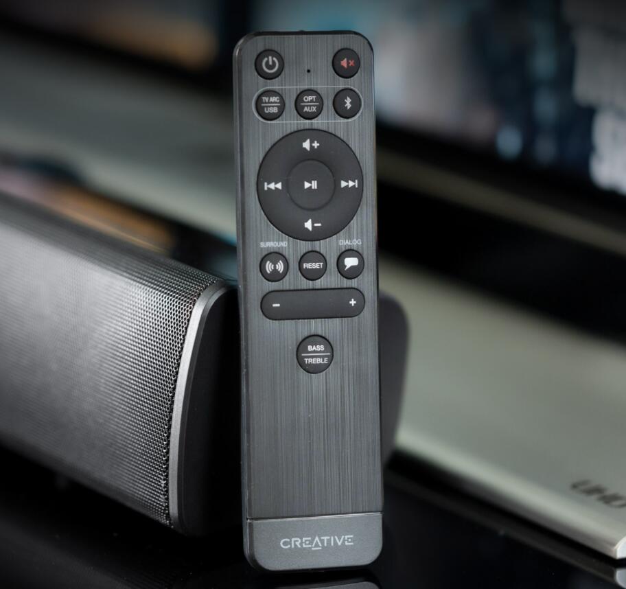 Creative Stage V2可以通過紅外遙控器*方便地操控,該遙控器不僅使您可以方便地控制播放功能,而且還可以調節高低音設置,更改輸入選項,同時還可以開關Clear Dialog和Surround設置。