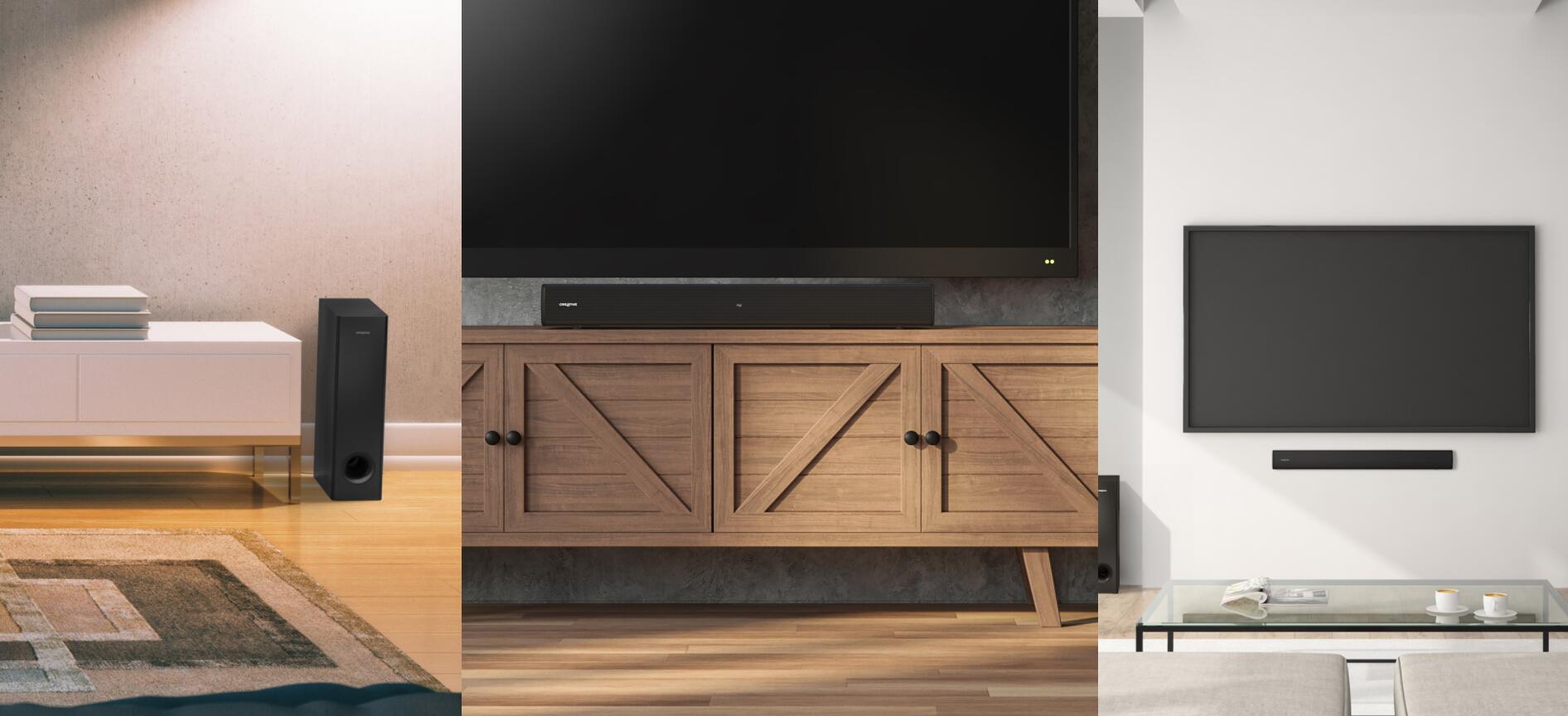 Creative Stage V2擁有簡約時尚的設計,無論室內設計如何,均可很好地融合到任何風格的房間。Creative Stage V2可巧妙地襯托您的電視機,不會從屏幕上奪走任何注意力,因為它的存在只會讓您電視的聲音響亮而清晰。