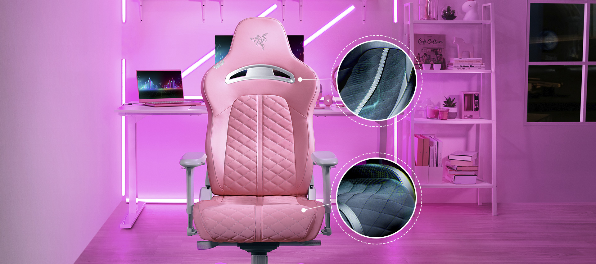 為了完美結合舒適度和耐用度,Razer Enki 的核心區域採用絨布材質的布面,能提供細緻的舒適感受,外側邊緣則襯以光滑皮革,更能抵抗日常磨耗。