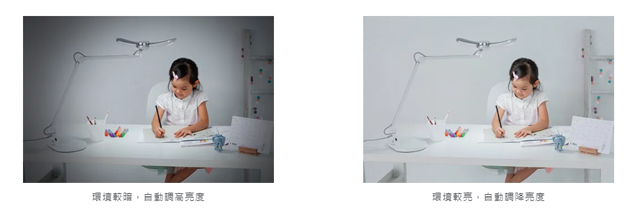 環境光感應器搭配亮度顯示面板,能夠主動偵測環境的亮度狀態,無論孩子在何處,都能提醒你現在環境的亮度是夠亮、太亮,還是太暗,一看面板,就知道夠不夠亮,可以幫助你透過旋鈕調節出最適當的光源亮度。
