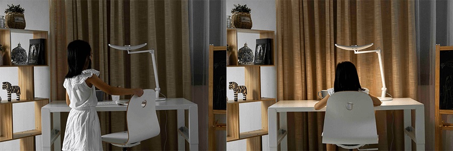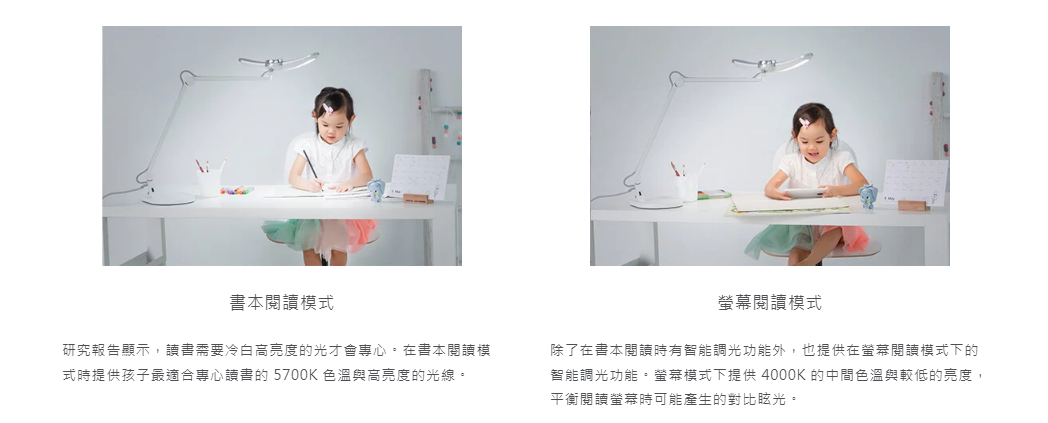 透過智能調光模式,MindDuo 親子共讀檯燈會隨著環境狀態提供充足的亮度,給孩子適合閱讀、寫字的舒適光線,不用再煩惱燈該開多亮。