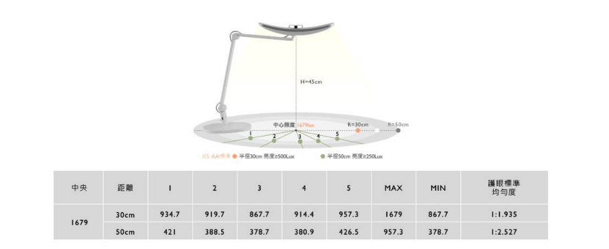 * 量測標準為燈頭水平距離桌面高度 45 公分,燈具調整至色溫 4000K 最高亮度