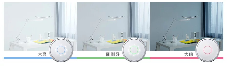內建智慧偵測器主動偵測環境的亮度,以三種不同顏色提示使用者,是否該補足桌面亮度,一看面板,就知道夠不夠亮!