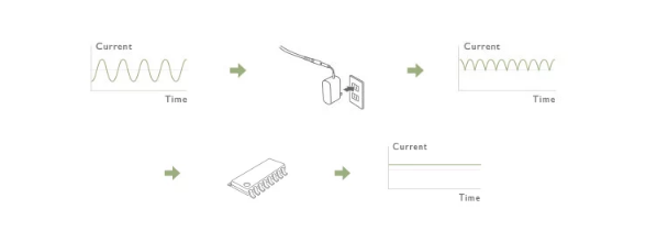 插座電源供電為交流電,透過變壓器輸出為直流電,再透過不閃頻驅動晶片達到光源穩定不閃爍。