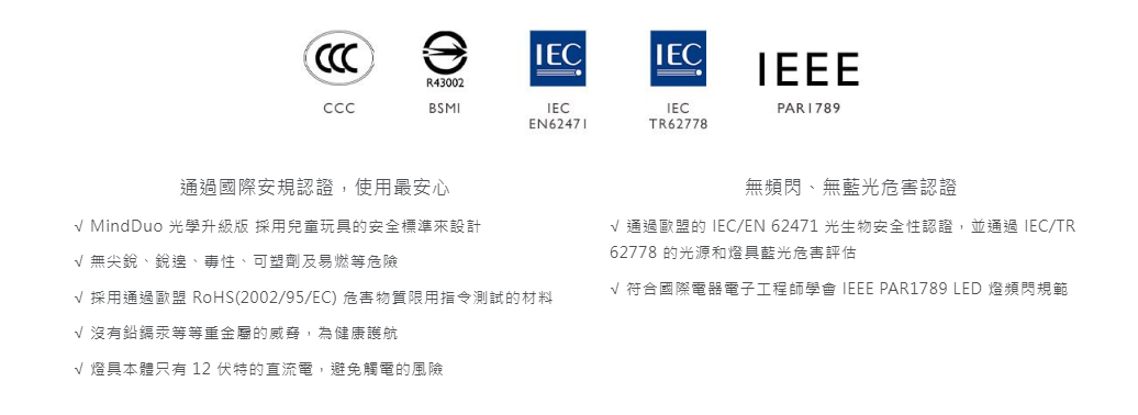 MindDuo 配備了不閃頻驅動晶片,讓光源穩定不閃爍。 同時符合國際電器電子工程師學會 IEEE PAR1789 LED 燈頻閃規範,無頻閃危害。