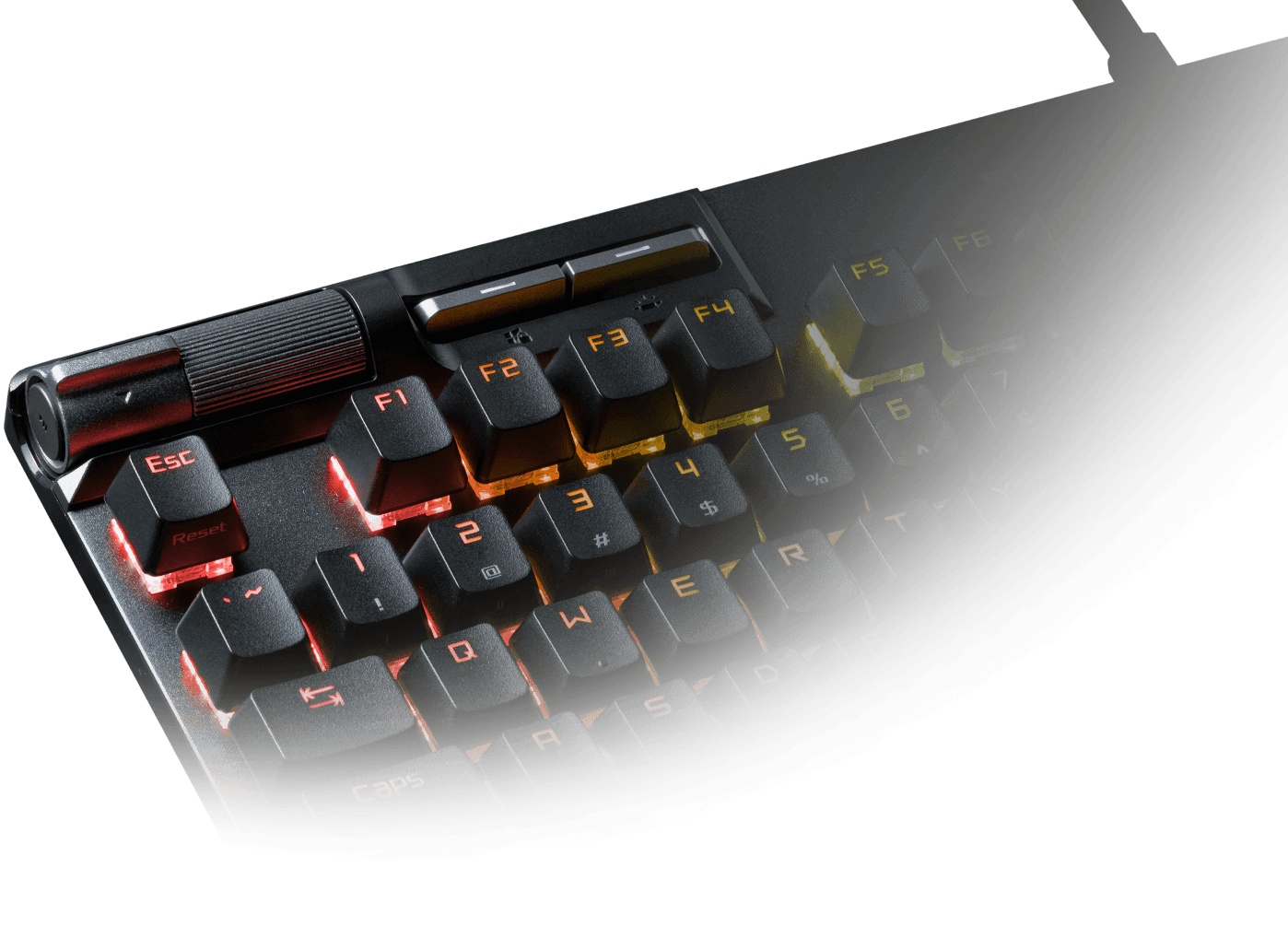 - ROG PBT 二色成型鍵帽:具備中等高度以及較短鍵桿以減少按鍵晃動,並具有半透明的 ROG 文字設計