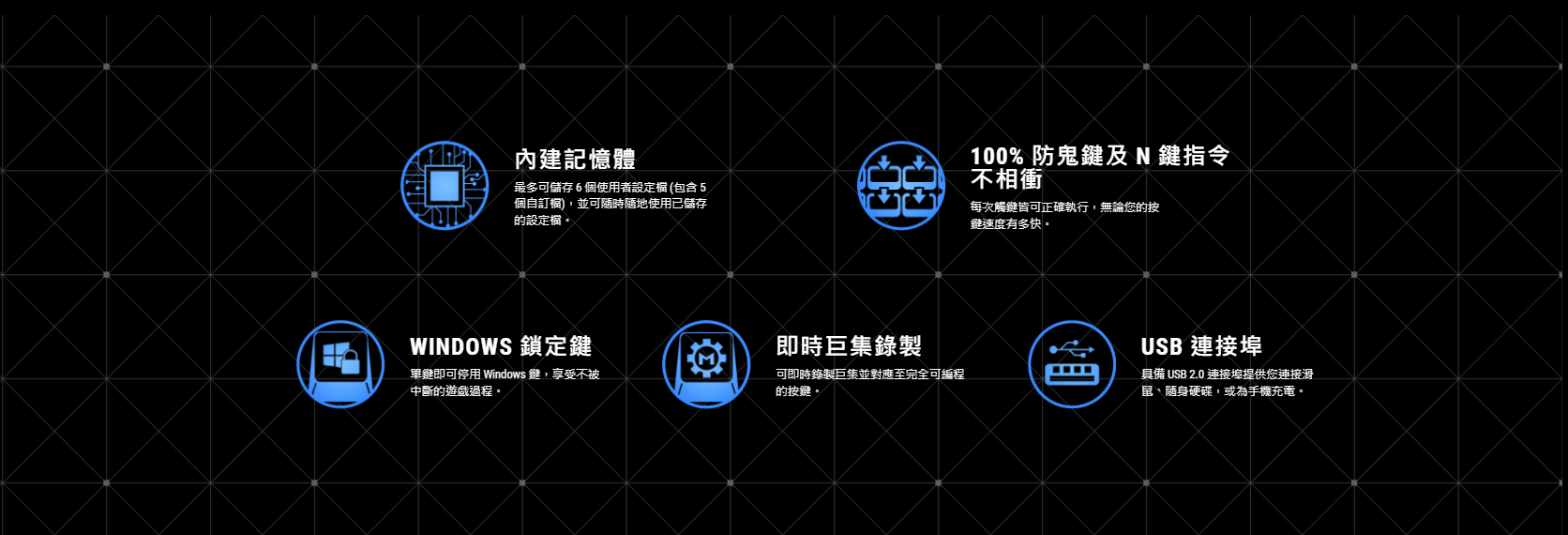 - ROG 鍵軸穩定器:經特殊設計可確保流暢的觸鍵與穩定性,以延長按鍵的使用壽命