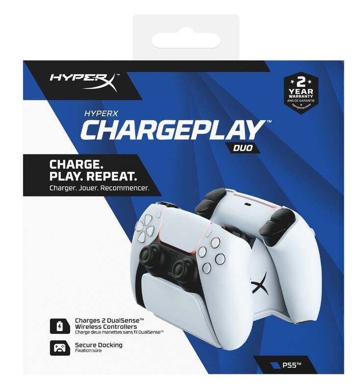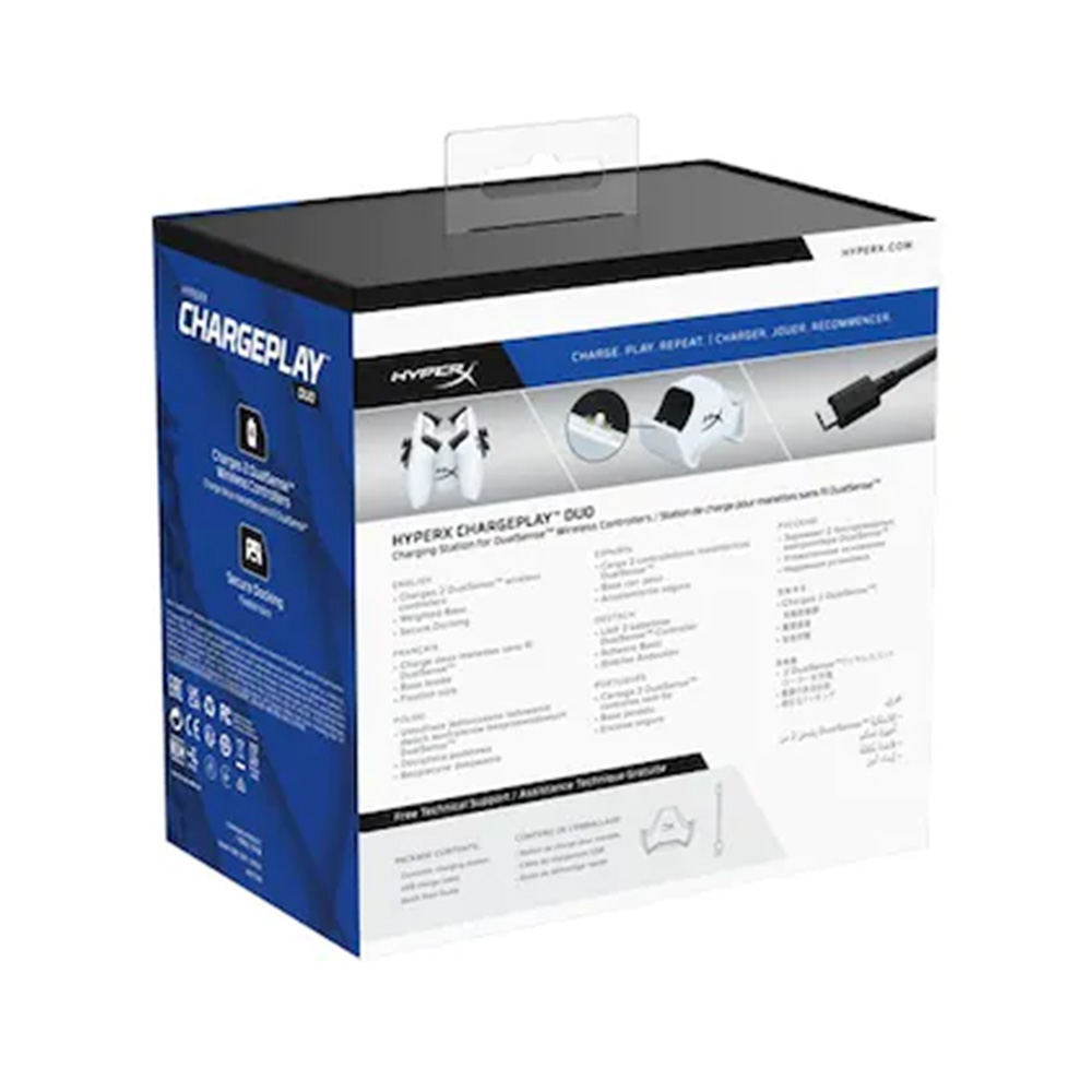 使用 HyperX ChargePlay™ Duo 同時充電兩支 DualSense™ 控制器。確保手邊隨時有一支電量滿載的控制器,方便在多人遊戲或長時間激戰中交替使用。具有穩固扎實的底座與質感白黑配色,完美搭配 PlayStation 5 的外觀。