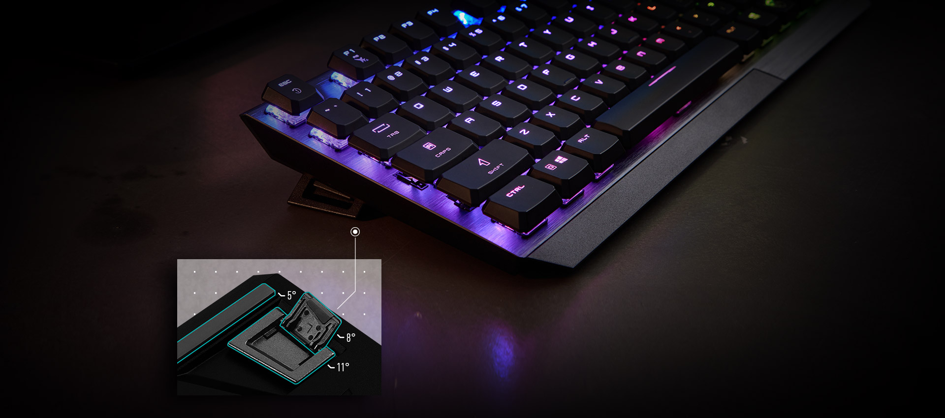 Two keyboard feet allow you to set your keyboard at 3 different tilt angles (5°, 8°, or 11°) creating a comfortable wrist position for any gaming session.