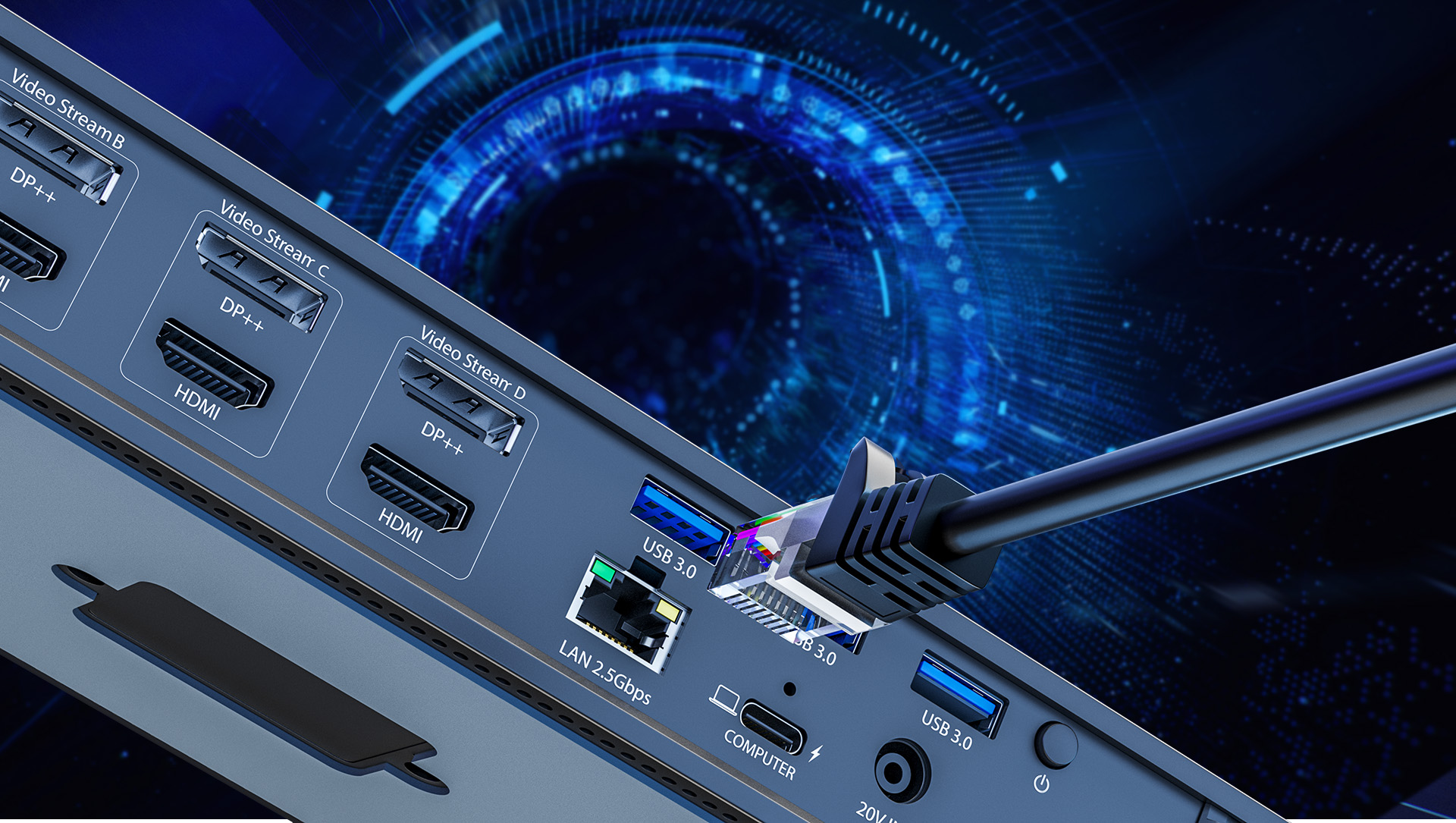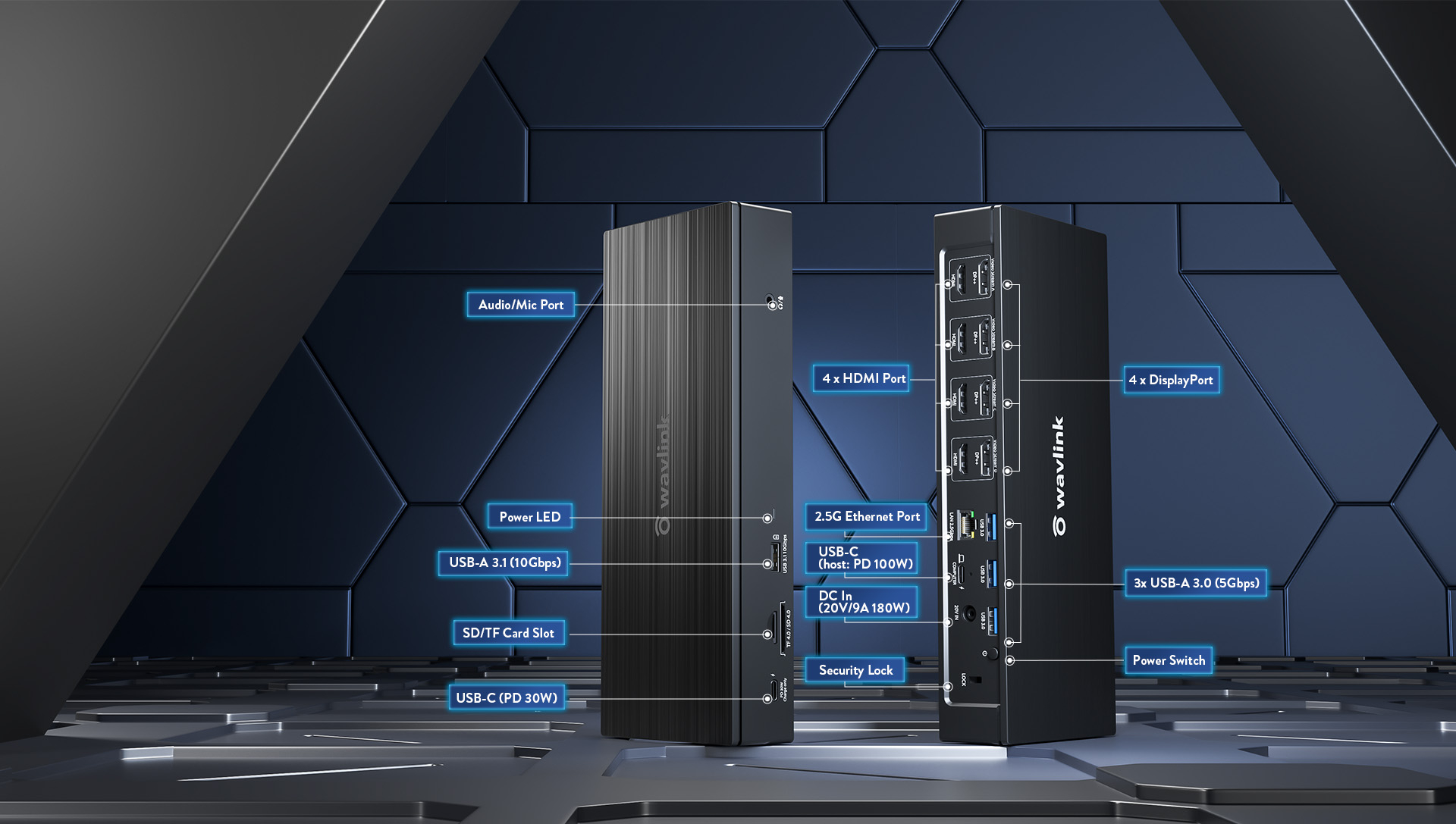 - 1 x USB-C (PD 30W), 3 x USB 3.0(5Gb/s), 1 x USB 3.1(10Gb/s), 1 x Type-C (host; PD 100W), 4 x DisplayPort & 4 x HDMI, RJ45 2.5G Ethernet, 3.5mm “two in one” audio/mic port, SD/TF card slot, DC 20V/9A 180Watt Power Supply, Power button