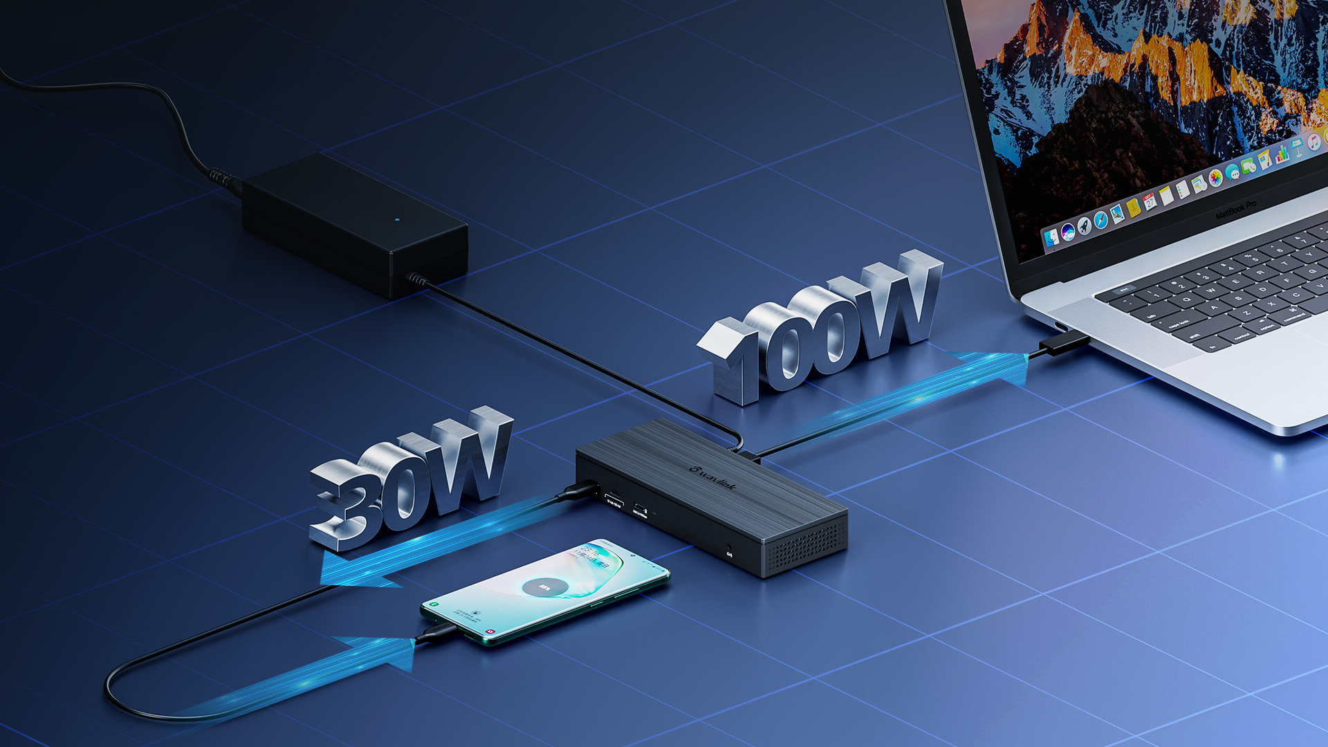 - The USB-C (host) charges your laptop with max. 100W power, and the USB-C port on the front supports 30W PD charging for any device that complies with USB PD charging