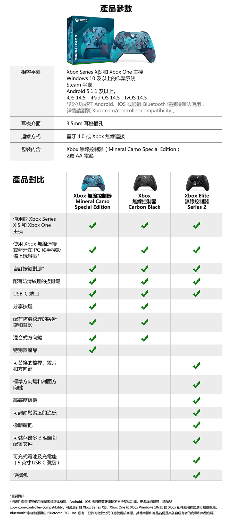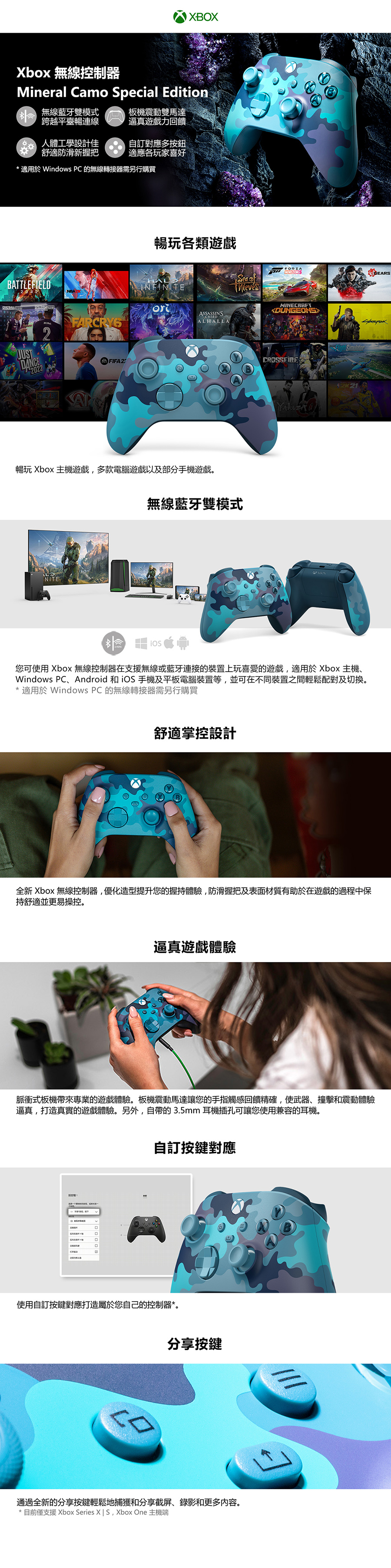 - 用於Xbox Series X|S主機外,同時對應Xbox One主機,還可透過藍牙用於Windows 10/11電腦、Android、iOS手機和平板電腦。