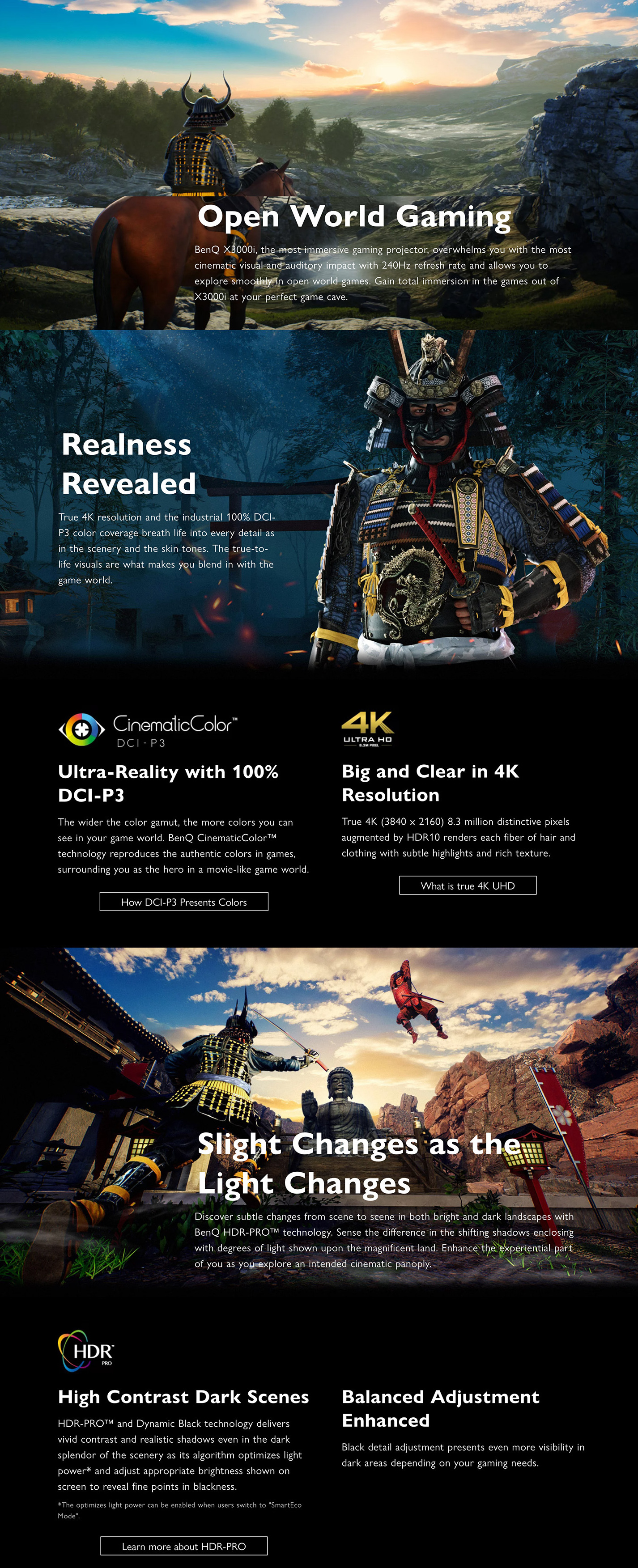 BenQ 獨家 HDR-PRO™ 技術針對投影機特性微調優化,強化 4K HDR 視覺觀看體驗。HDR-PRO™ 強化對比範圍,遊戲中的日夜變化、陽光、陰影下的明暗對比,帶來前所未有的沉浸體驗。