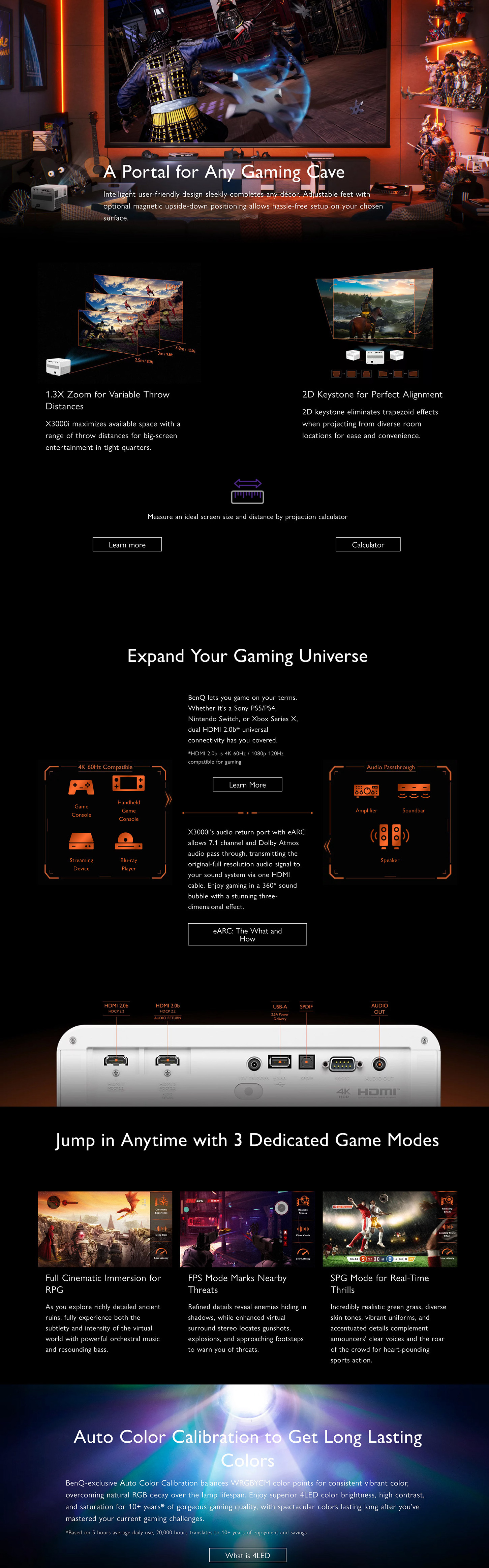 BenQ X3000i 可呈現 100% 電影工業最高等級 DCI-P3 電影廣色域、HDR-Pro 高動態範圍影像、最高 240 Hz 刷新率、4ms 低輸入延遲,搭配 2 顆 10W 立體聲喇叭、並支援 eARC 7.1 CH Dolby Atmos 聲音回傳功能,將帶來如同電影般的臨場感、感受最極致沉浸的遊戲體驗