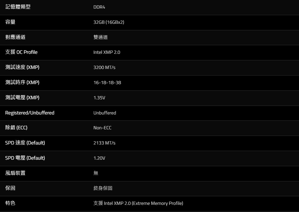 類別 F4-3200C16D-32GTZN F4-3600C18D-16GTZN F4-3200C16D-16GTZN