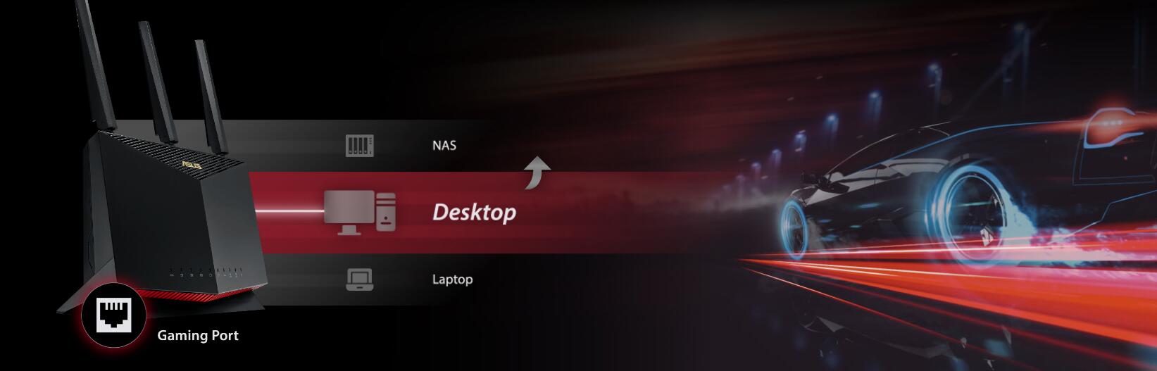 RT-AX86U Pro 的遊戲專屬連接埠可提高所連接任何有線裝置的網路優先順序。無需複雜的設定,只要將您的電競 PC 或遊戲主機連接至此 LAN 連接埠,即可提供您快速穩定的連線,讓連線的裝置永遠位居最高的網路優先順序。