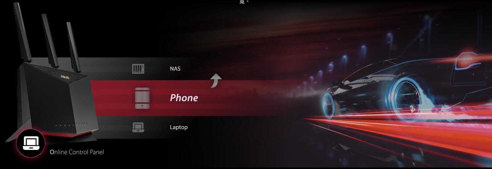 裝置加速器 (Gear Accelerator) 可讓您透過 RT-AX86U Pro 的線上控制面板,以無線方式設定裝置的優先順序。其簡易的介面可讓您設定裝置的優先順序,以大幅提升其速度,並避免與其他裝置競爭取得頻寬。