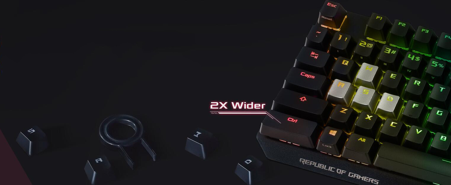 世界一流的 ROG 研發團隊仔細研究 FPS 遊戲玩家的遊戲風格,根據研究結果打造出較傳統 Ctrl 按鍵大兩倍以上的按鍵。Xccurate 設計從此誕生:超寬 Ctrl 鍵可降低按錯鍵的機率,達到更高的精準度。此款鍵盤隨附四個銀色鍵帽,使用者可輕易識別 WASD 按鍵群,甚至附帶鍵帽拔鍵工具以輕鬆進行自訂。