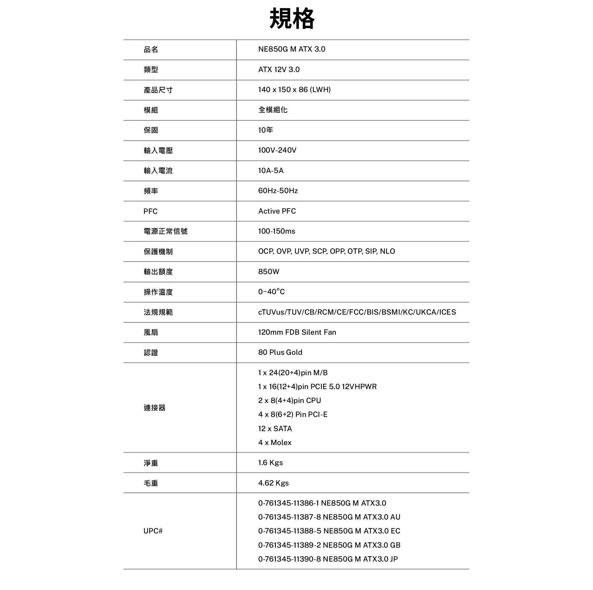 類別 黑色-750W-80+ Gold 黑色-850W-80+ Gold 白色-850W-80+ Gold 黑色-850W-80+ Gold-ATX3.0 黑色-1000W-80+ Gold-ATX3.0 白色-1000W-80+ Gold-ATX3.0 黑色-1300W-80+ Gold-ATX3.0