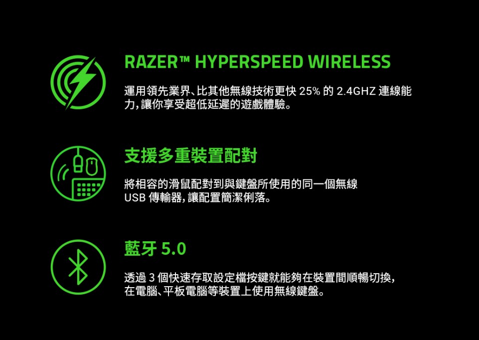 - 可透過 Razer™ HyperSpeed Wireless (2.4 Ghz)、藍牙或 Type-C 連接
