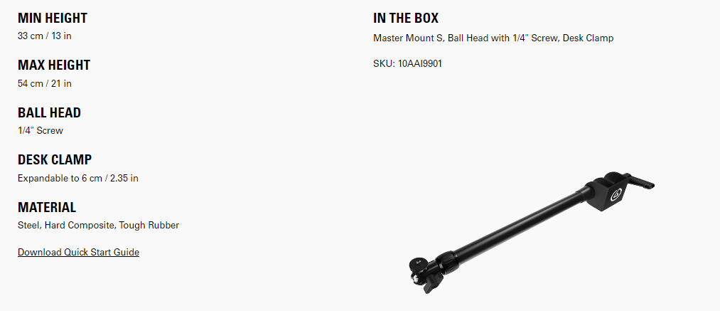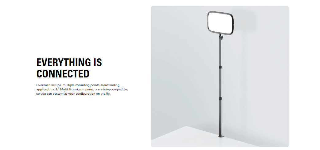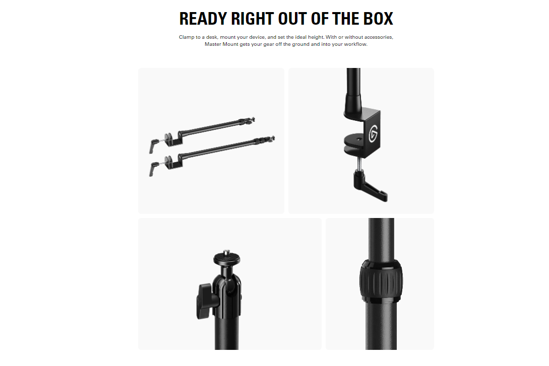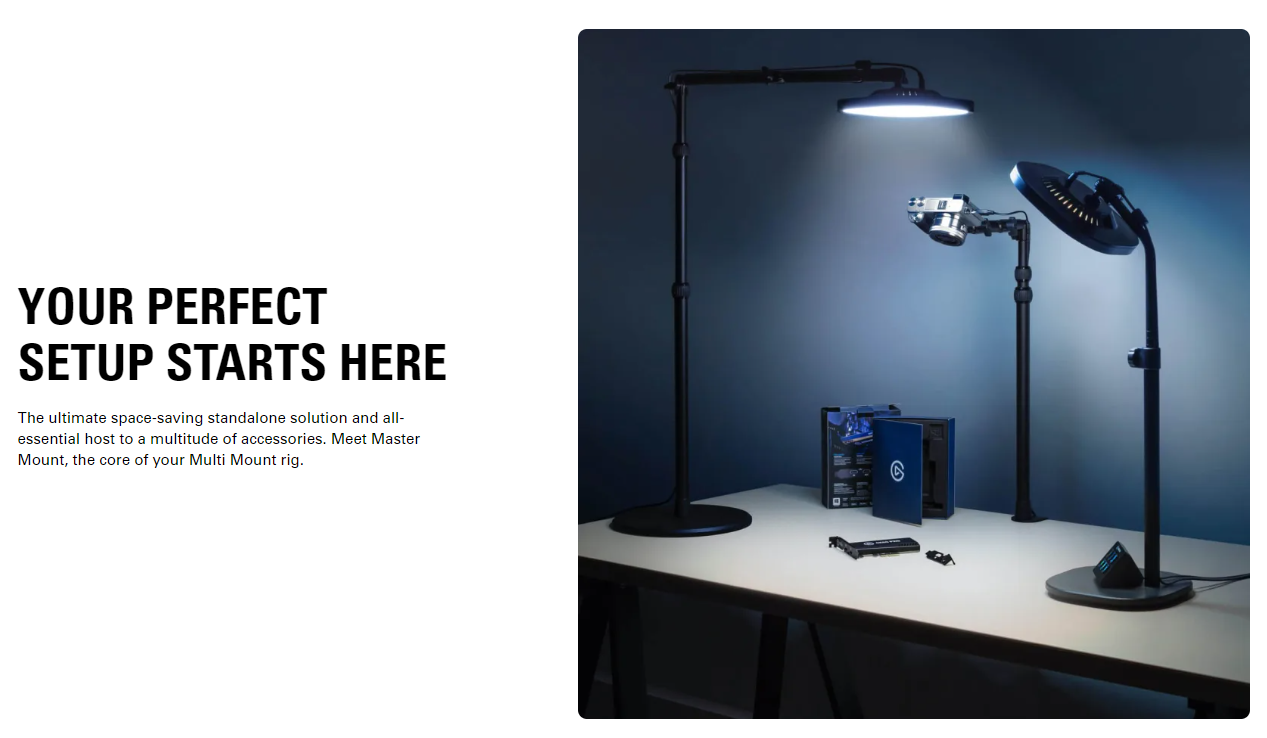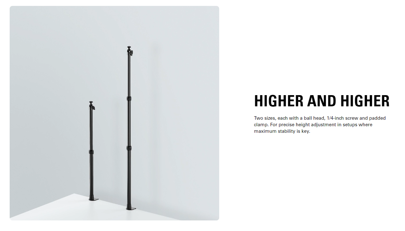 Master Mount S is both a space-saving standalone solution and essential core of Multi Mount, a modular rigging system for cameras, lights and more. Height adjustable from 33 cm / 13 in up to 54 cm / 21 in.
