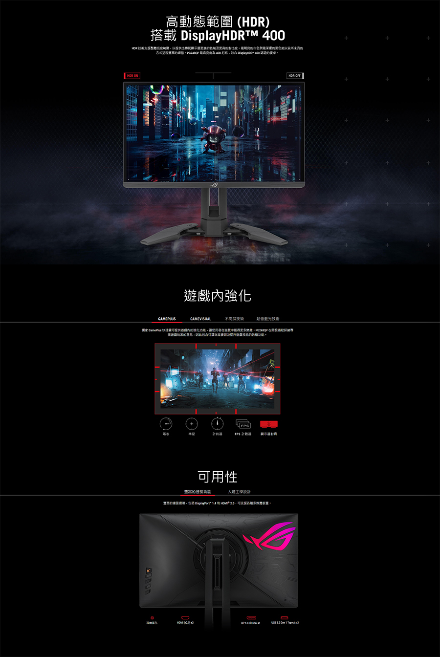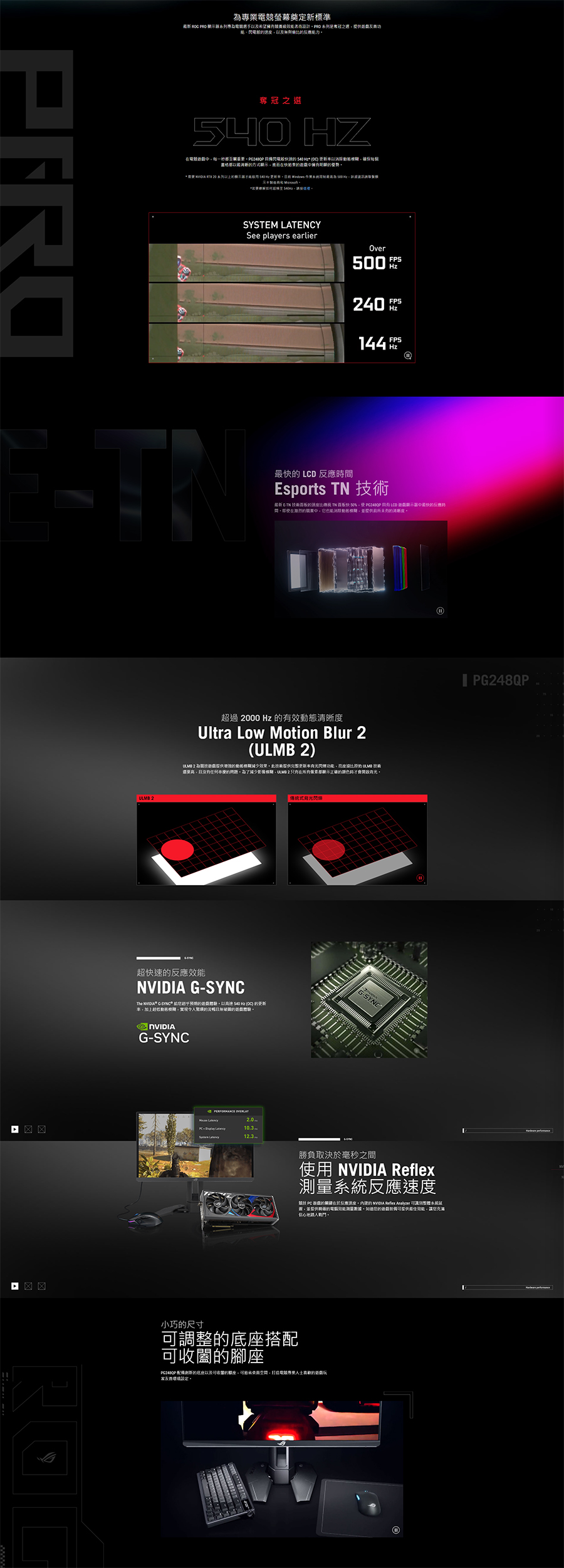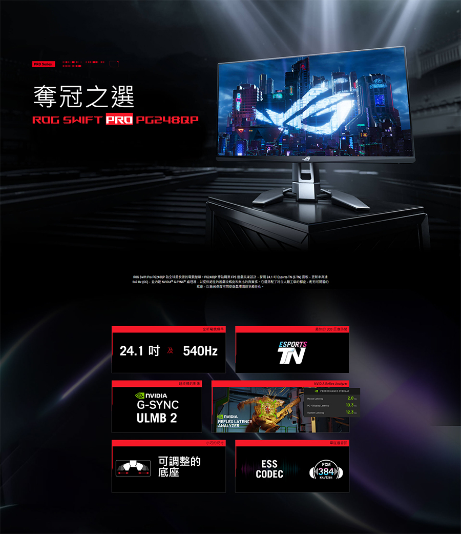 - 24.1 吋 Full HD (1920 x 1080) Esports-TN (E-TN) 電競螢幕,具備 540 Hz (OC) 更新率,專為專業遊戲玩家設計