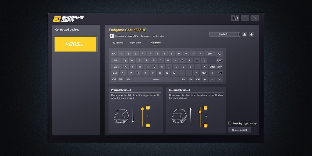 Utilizing the innovative Hall effect principle, our KB65HE will redefine your gaming experience. Each keystroke is detected by a state-of-the-art sensor responding to magnetic field changes. This means no physical contact, resulting in unparalleled durability and longevity. Tailor your gameplay with an adjustable actuation point, ranging from 0.1mm to a 4mm, allowing you to customize each key to your exact preference. When combined with our Rapid Trigger Technology, this guarantees lightning-fast response times, giving you the competitive edge in every game.