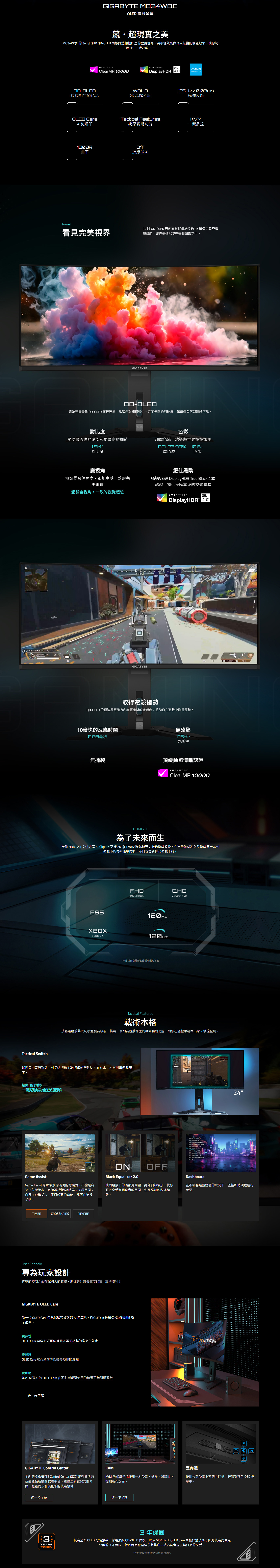 MO34WQC 的 34 吋 QHD QD-OLED 面板打造栩栩如生的虛擬世界,突破性效能與令人驚豔的視覺效果,讓你沉浸其中,嘆為觀止。