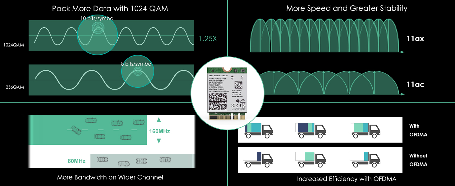 1024-QAM 和 OFDMA:這些先進的調變技術增強了數據吞吐量和效率。1024-QAM 增加了每個符號傳輸的位數,而 OFDMA(正交頻率分割多址)則優化了擁擠環境中的信道分配,以提高性能。