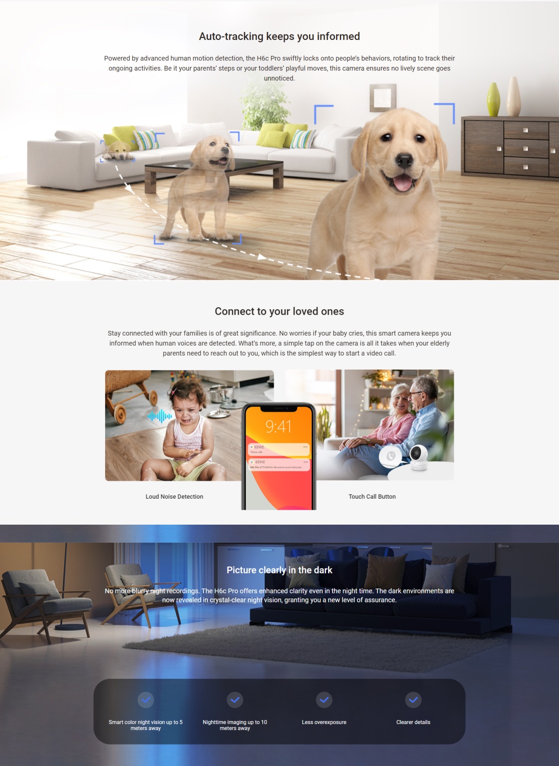 Motion detection, Human Detection, Human Tracking, Big Noise Detection, Auto patrol |
