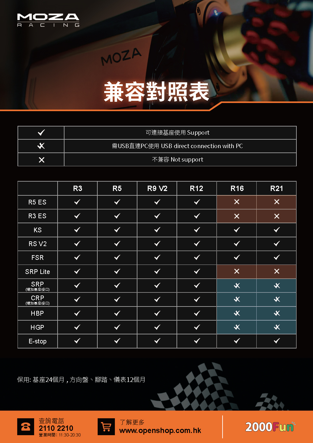 注意:如缺少上述資料,2000Fun有權拒絕對該貨品進行保養維修。如發現任何未經Moza Racing官方 或 代理商2000Fun同意情況下自行拆解、維修設備,表示顧客自行放棄該產品所有保養權益,2000Fun不承擔任何損失及賠償。