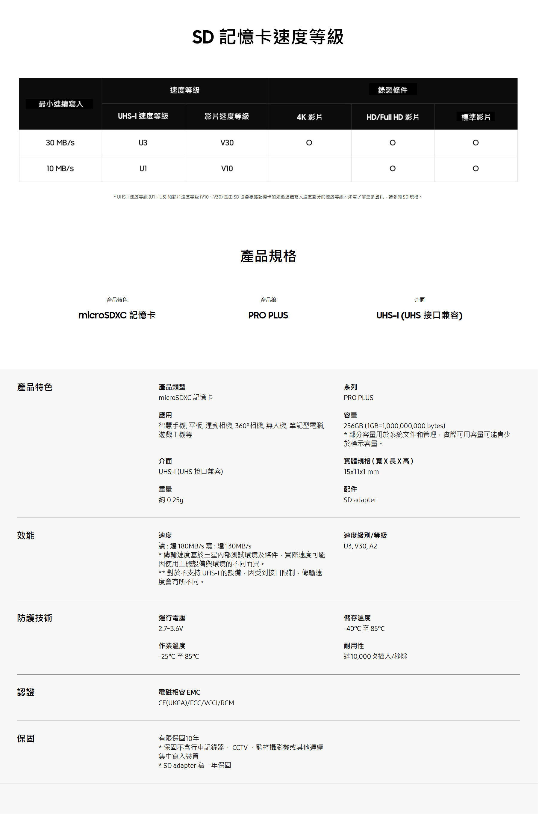 【10年保用】Samsung 三星 Pro Plus R/W 180/130MB/s U3 V30 Micro-SD(請保留包裝, 以便日後保養)(256GB)