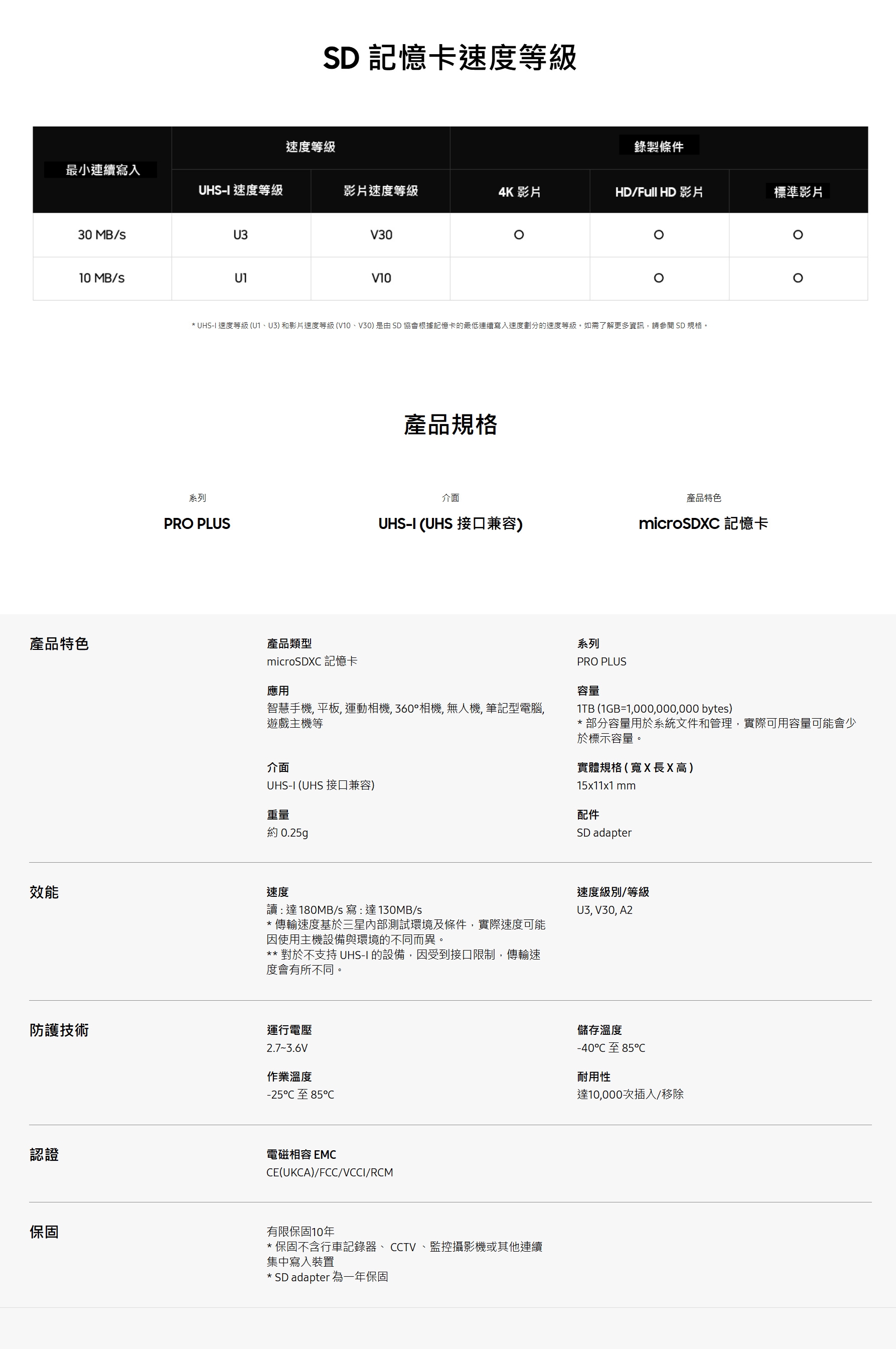 【10年保用】Samsung 三星 Pro Plus R/W 180/130MB/s U3 V30 Micro-SD(請保留包裝, 以便日後保養)(1TB)
