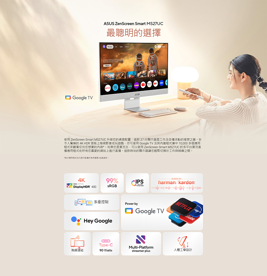 - 採用 Google TV,擁有 10,000 多個應用程式和個人化推薦