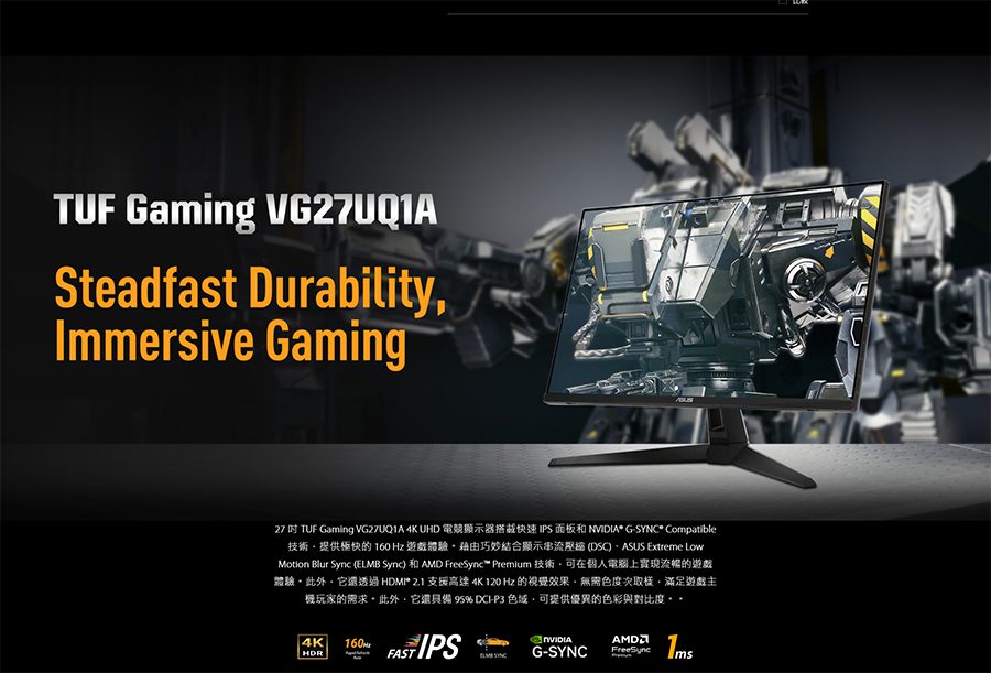 - ASUS Extreme Low Motion Blur Sync (ELMB Sync) 技術可讓 ELMB 與可變更新率技術同時運作,以消除殘影及破圖的情形,並透過高畫格率提供銳利的遊戲影像