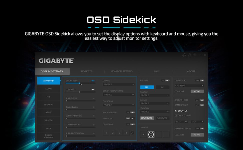螢幕往往在遊戲過程中被低估,認為是最無關緊要的小角色,然而,只有高規格的螢幕搭配高效能的硬體規格,才能完美地發揮加乘作用,展現最極致的遊戲效能! GIGABYTE GAMING系列電競螢幕提供最頂級的面板規格,高畫質的影像輸出,搭配多款戰術型功能,是您完美致勝的唯一關鍵,一起Join the Fight吧!