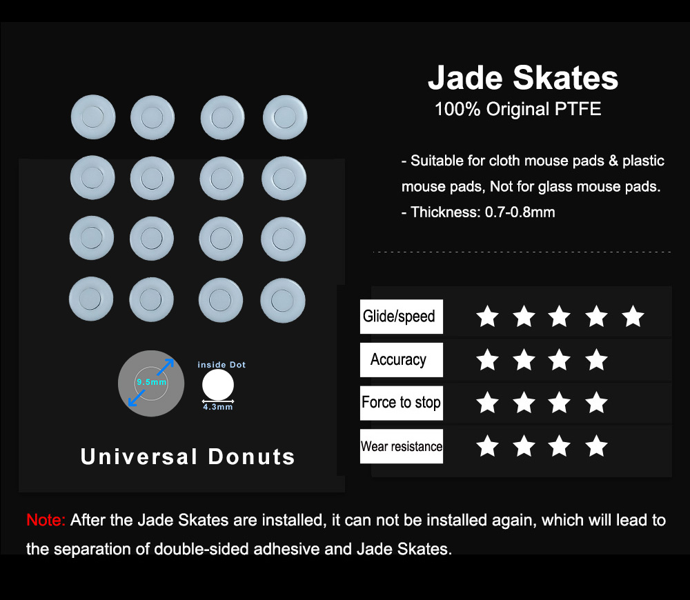 Jade DIY Mouse Skates – Universal 0.8mm PTFE Donuts with diameter 9.5mm, offer more smooth gliding. More stable movement and less noise. which is made of pure PTFE with One-piece molding processing, smooth and flat surface, precise fit, allowing the mouse to move more smoothly.