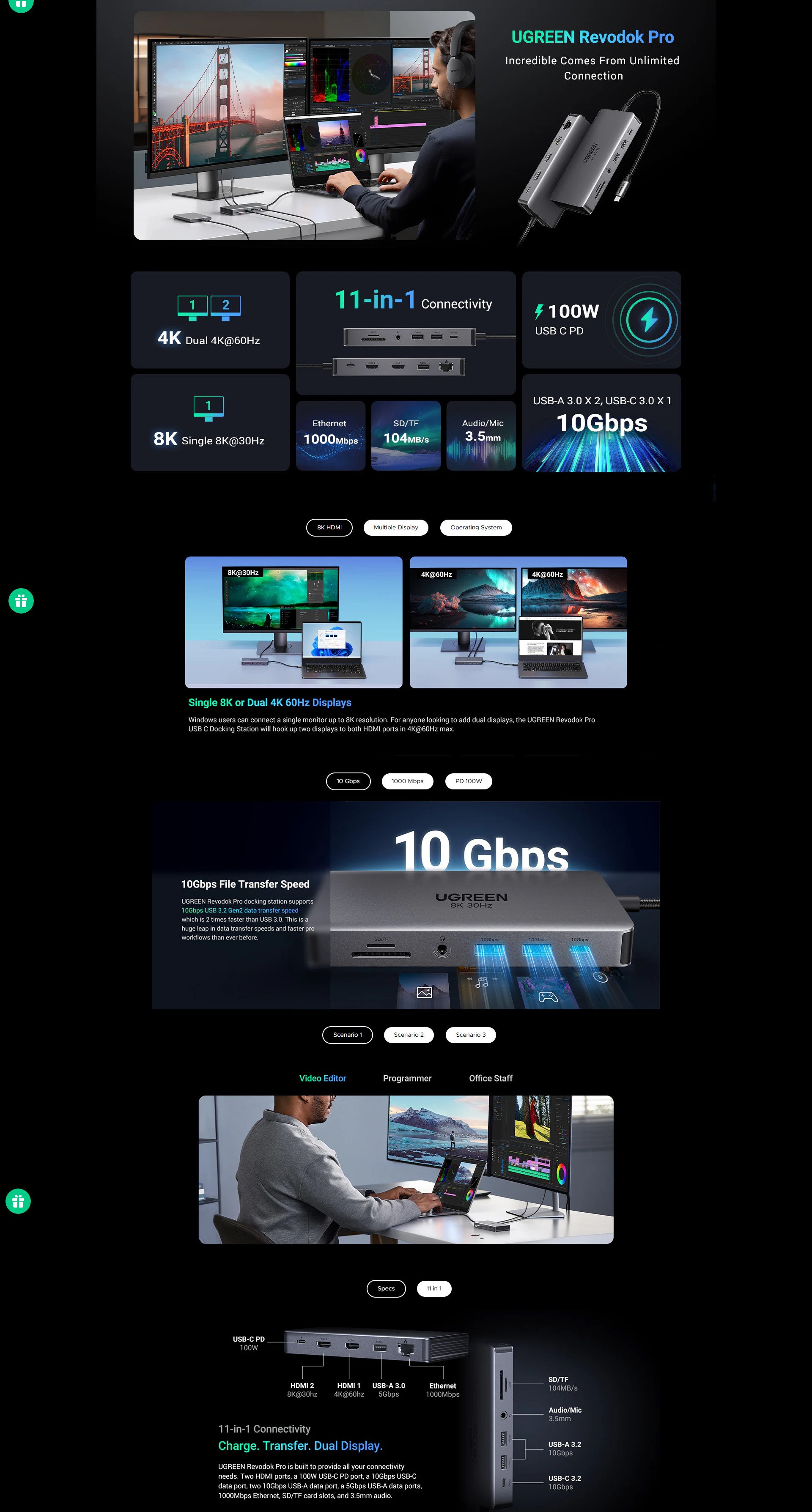 - 100W 供電:支援透過 PD 連接埠進行 85W USB-C 直通充電,預留 15W 用於其他操作。