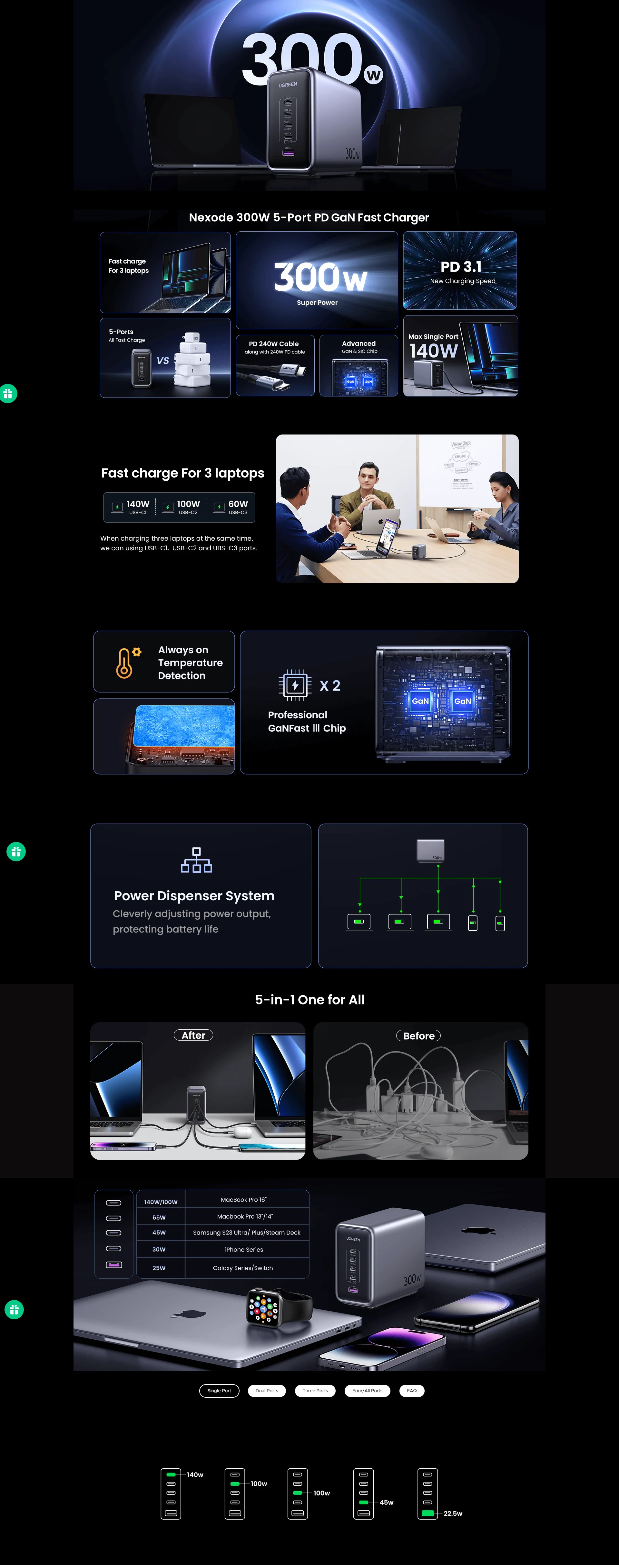 - 300W超級功率:同時為最多5台裝置充電,最大輸出功率為300W。