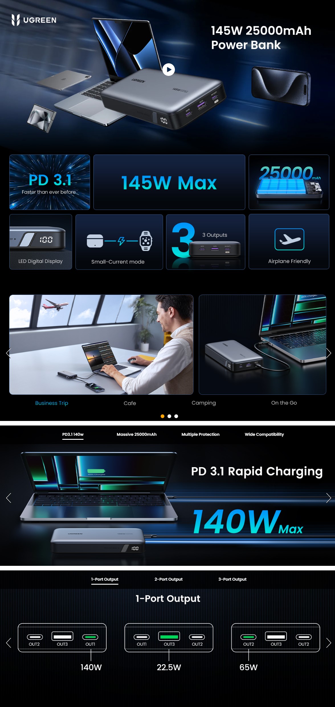 - 25000mAh超大容量:25000mAh電池,100W輸出。為筆記型電腦充電 1.3 倍,為裝置充電 5.6 倍。