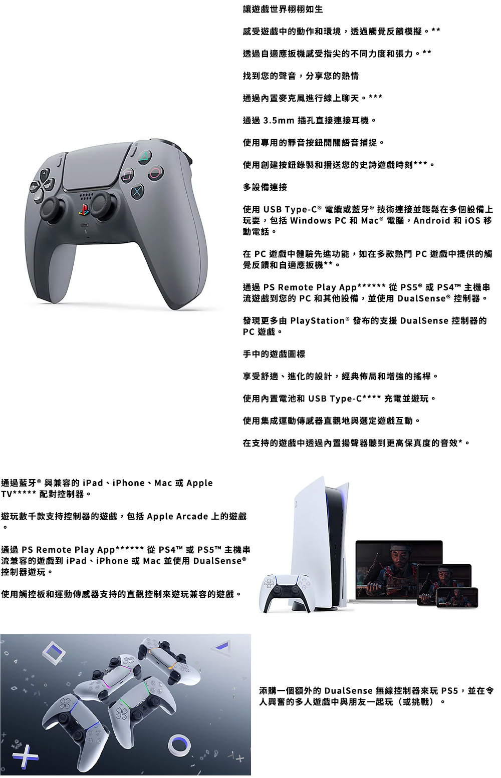 兼容 Apple 設備:通過藍牙與兼容的 iPad、iPhone、Mac 或 Apple TV 配對,並使用 PS Remote Play 應用程序從 PS4 或 PS5 主機串流遊戲。
