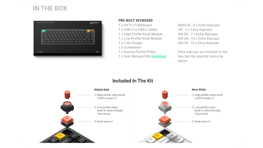 The world's most beloved low profile keyboard has returned, with a few mms off its waist, but gains in almost everything else. The switches now travel as deep as high profiles, and the battery goes much longer. There is a new colorway, more lights, and more colorful lights. Oh, and a new knob when you need more turning than pressing. Wanna unlock more secret powers? don't forget to check out NuPhyIO 2.0 to supercharge your Air75 V3 even more.