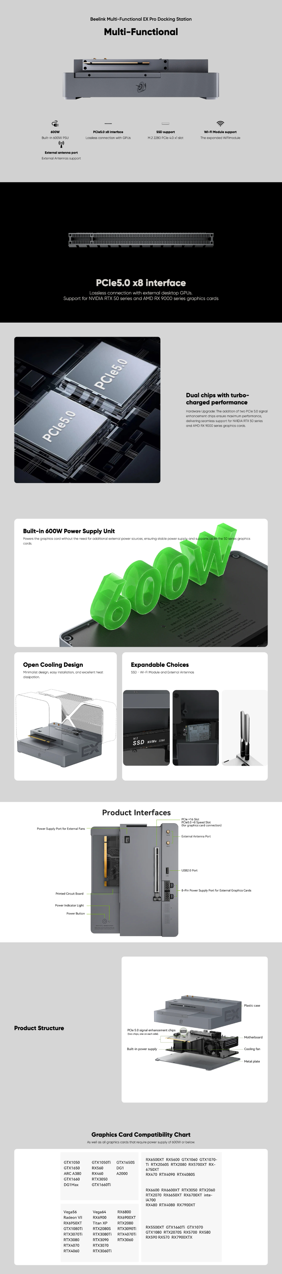 - Beelink 多功能 EX Pro 擴充塢支援獨立顯示卡擴充:適用於 GTi Ultra 系列 Beelink 迷你電腦(GTi14>i13>i12)與獨立顯示卡,滿足各種高速圖形需求。開放式設計不限制顯示卡尺寸,確保與 AMD 和 NVIDIA 各型號完美相容。