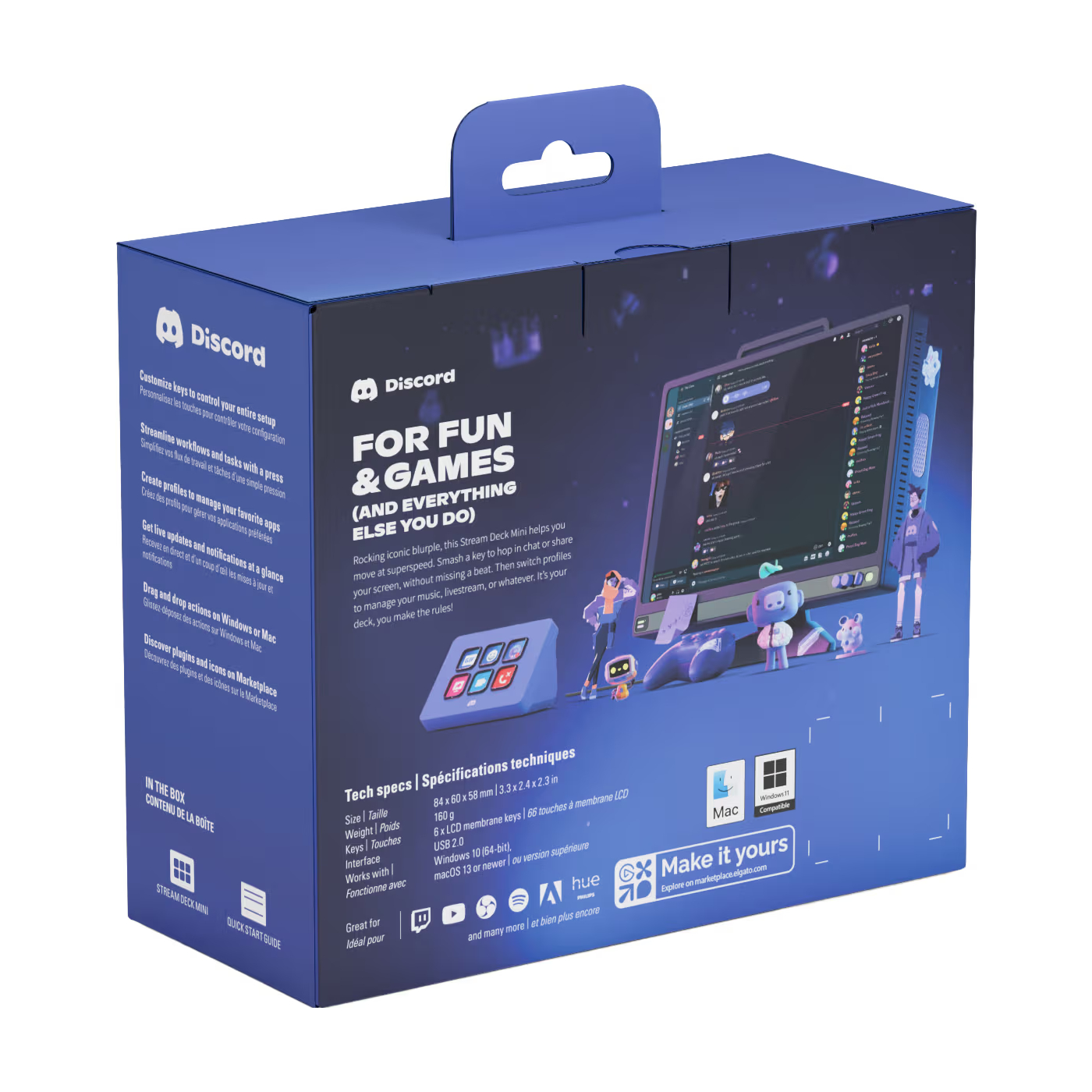 Elgato Steam Deck Mini Discord Edition 直播控制台提供 6 個可自訂的 LCD 按鈕、用於靜音、靜音或更改頻道的無縫 Discord 控制,以及與 OBS、Twitch 和 YouTube 的整合。它具有緊湊的即插即用設計、多功能設定和拖放軟體自訂。