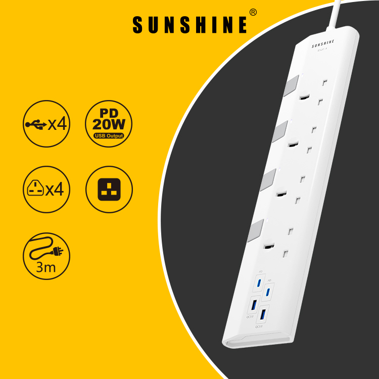 SUNSHINE ESUF-3 快充拖板 2C2A 13A 獨立提示燈開關拖板+USB充電位(20W-三位)