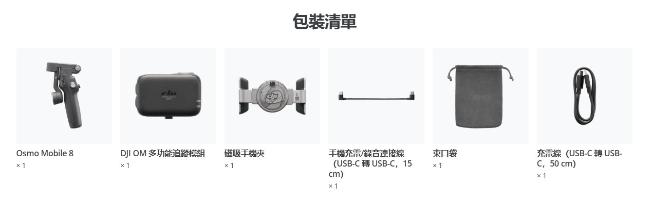 - 雲台 + 内建三腳架 + 磁吸手機夾 + 多功能追蹤模組:約 370 公克