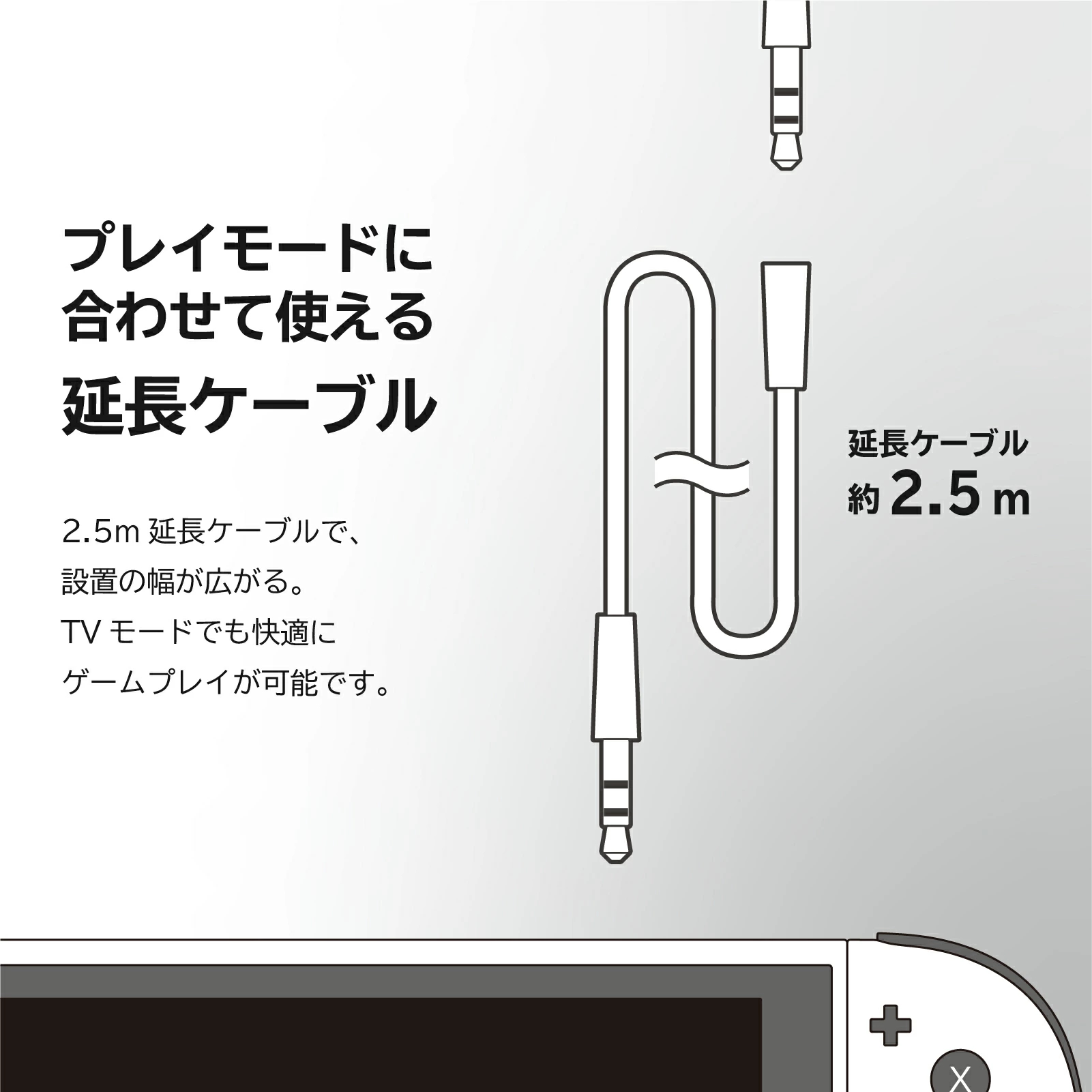 2.5 公尺延長線提供更廣泛的安裝選擇。即使在電視模式下也能享受舒適的遊戲體驗。