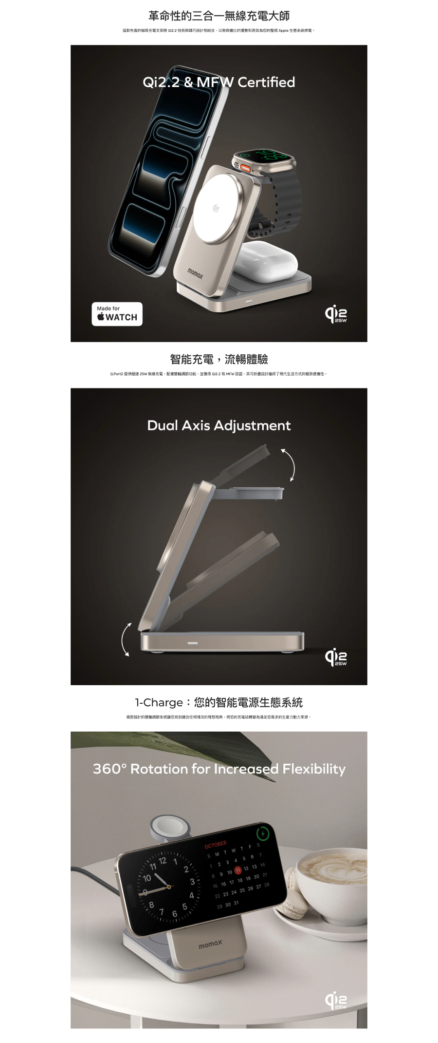 Momax 1-Charge Q.Port2 隆重推出-一款革命性的三合一磁吸無線充電支架,重新定義您的數位生態系統充電方式。