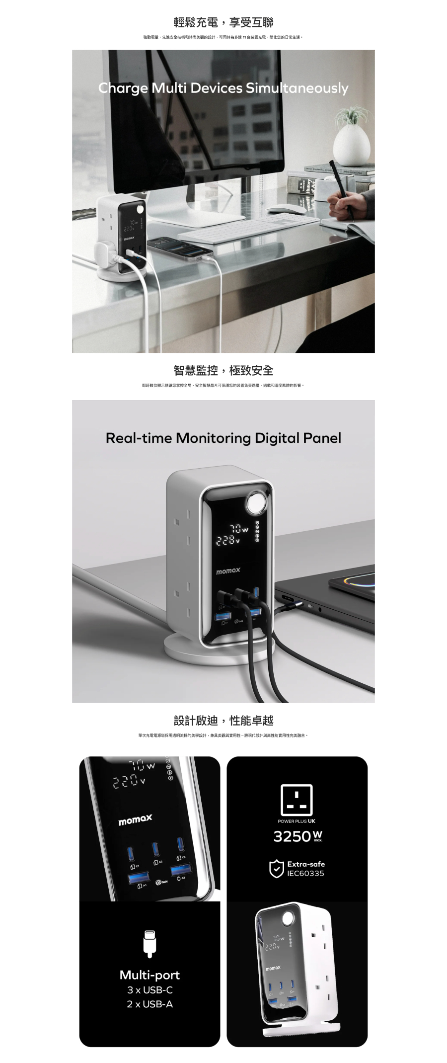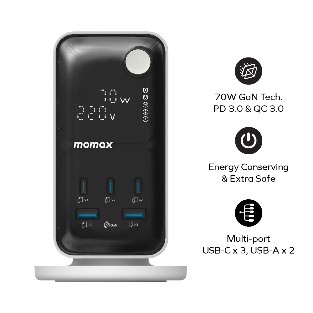 - 70W 大功率充電,配備 6 個多功能插座和 USB 接口,可同時為多台設備充電
