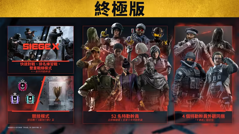 取得《虹彩六號:圍攻行動 X》終極版,即可遊玩所有遊戲模式,並可立即解鎖額外 52 名特勤幹員!